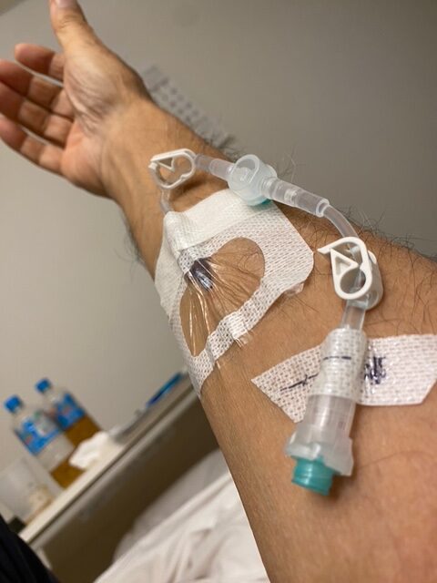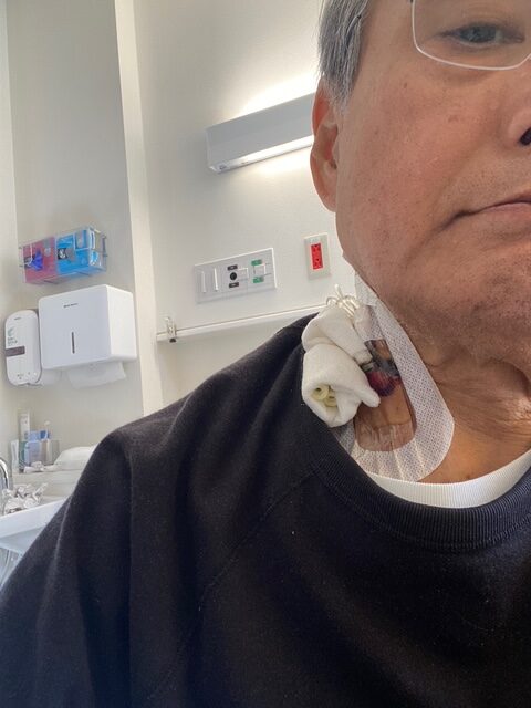 治療、、、寝たきり状態から復活後の点滴と首は人口透析の管です